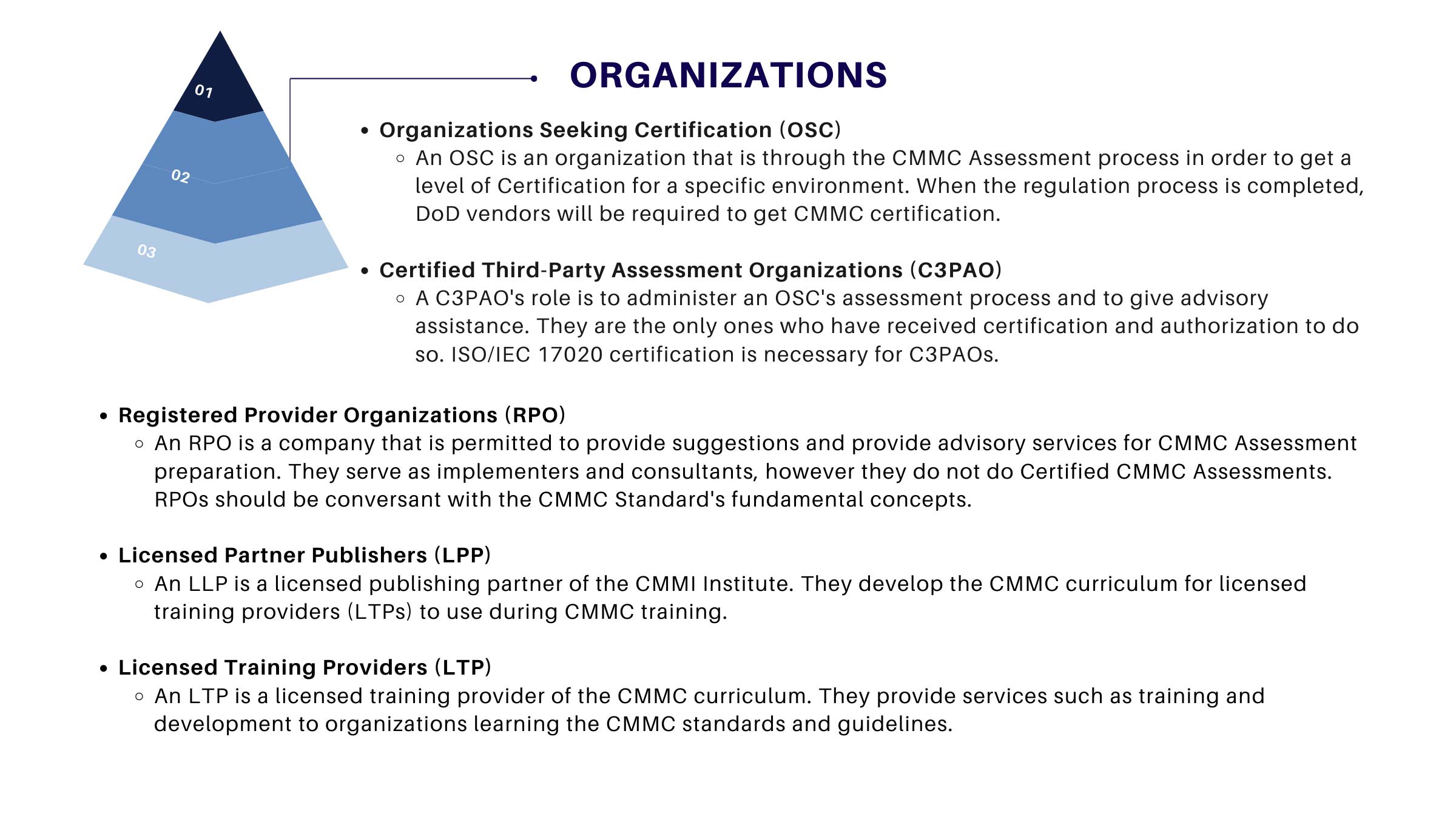 - Organizations striving to meet CMMC Maturity Level 3, “Expert” will require an assessment to be conducted by the federal government, not a third-party assessor.